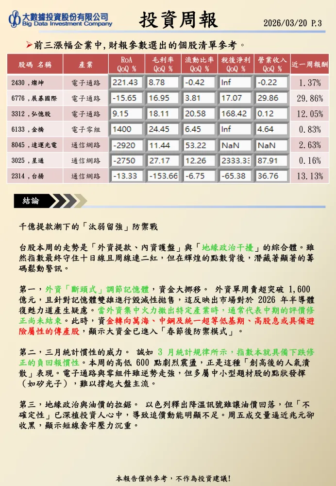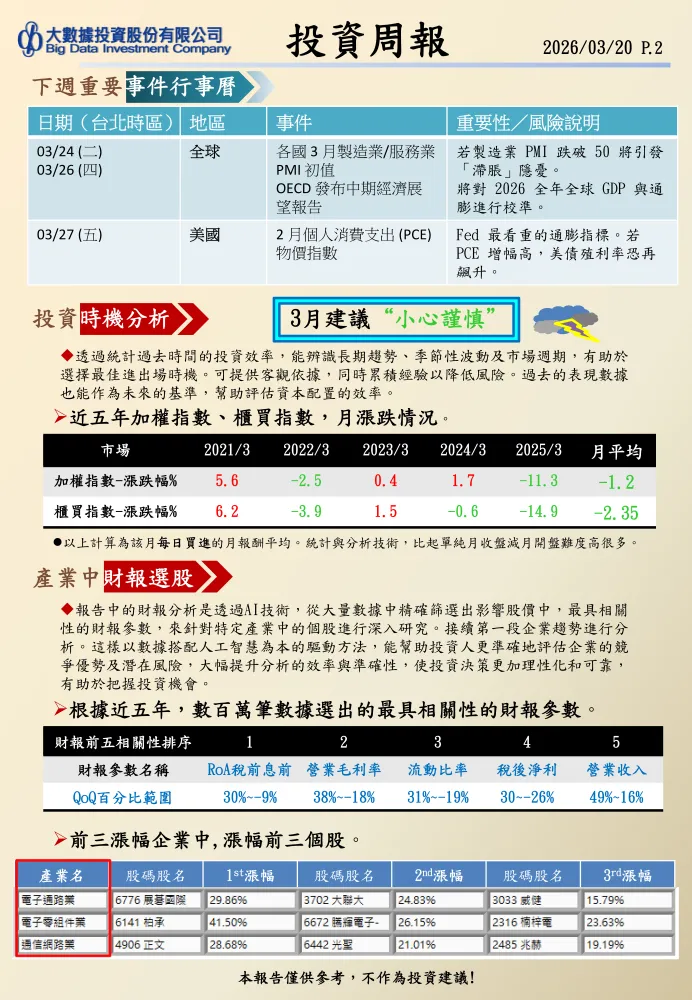上週台股產業表現分化,資訊服務類指數以 15.3% 的漲幅領跑,遠超其他類股;電腦及周邊設備類和綠能環保類分列漲幅榜第二、第三位,漲幅分別為 3.4% 和 2.9%。但值得注意的是,油電燃氣類指數已連續五周位列跌幅前三,成為市場弱勢板塊的焦點。
