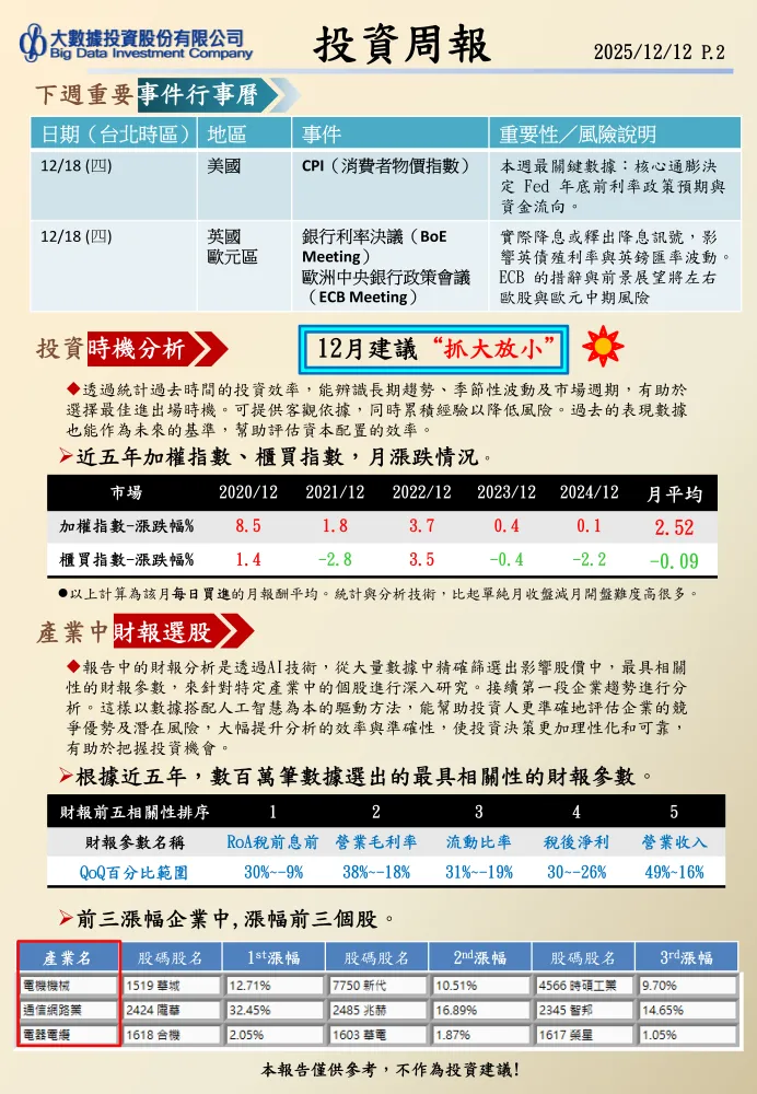 過去一週,資訊服務、生技醫療與數位雲端類股成為市場焦點,分別上漲14.5%、6%、4.8%,顯示市場資金正在向數位與醫療板塊轉移。然而,油電燃氣類股卻由春節前一周的強勢股轉為本週跌幅最深,半導體類股則在頸線位置盤整,市場觀望其突破動能。整體而言,大盤在新春開紅盤後表現疲弱,加權指數週跌0.2%,類股輪動劇烈。 展望2月,根據過去五年數據,台股普遍走弱,加權指數與櫃買指數分別平均下跌1.7%與1.5%。在此背景下,投資人應該如何調整策略?本期週報將深入解析產業趨勢,幫助投資人在震盪市場中尋找穩健布局的方向!
