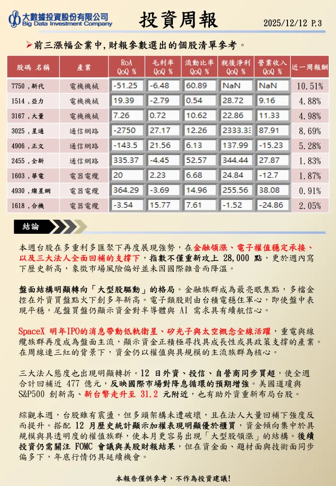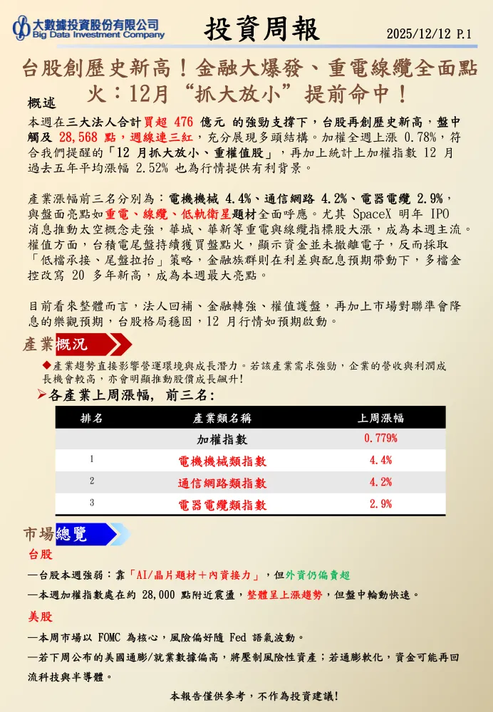 上週台股產業表現分化,資訊服務類指數以 15.3% 的漲幅領跑,遠超其他類股;電腦及周邊設備類和綠能環保類分列漲幅榜第二、第三位,漲幅分別為 3.4% 和 2.9%。但值得注意的是,油電燃氣類指數已連續五周位列跌幅前三,成為市場弱勢板塊的焦點。