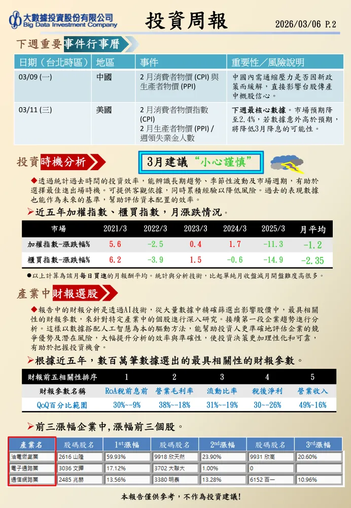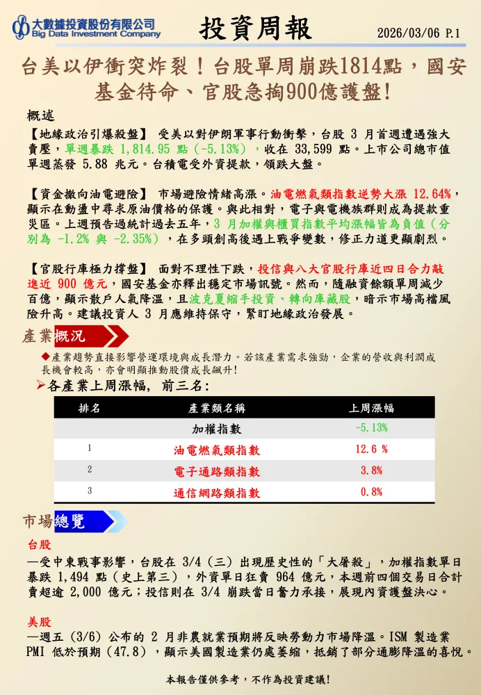 上週台股加權指數下跌2.99%,拖累多數產業走低。漲跌幅前三的產業中,僅生技醫療類微幅上漲0.12%,而橡膠類和貿易百貨類則分別下跌0.29%和0.57%。特別值得注意的是,油電燃氣類股已連續四周居跌幅前三,表現持續低迷。