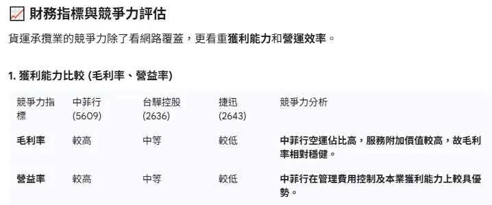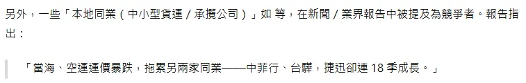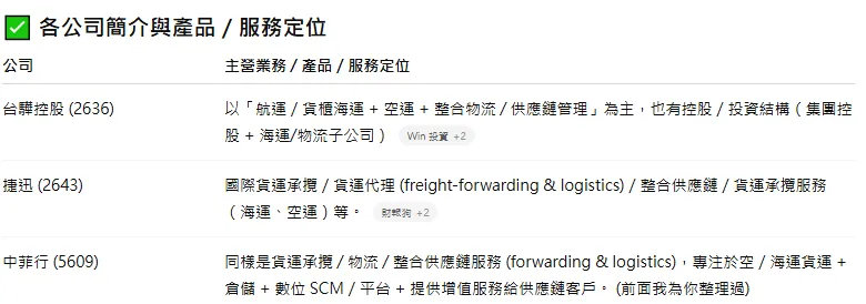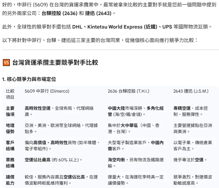 看起來相對舒服的情況下,我返回去問一開始的問題:『幫我找中菲行同產業的主要對手,比較其競爭力』,一樣節選如下: