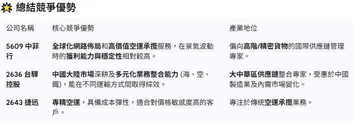 公司主力為國際空/海運與整合物流,並聚焦高科技貨品與數位化平台。
