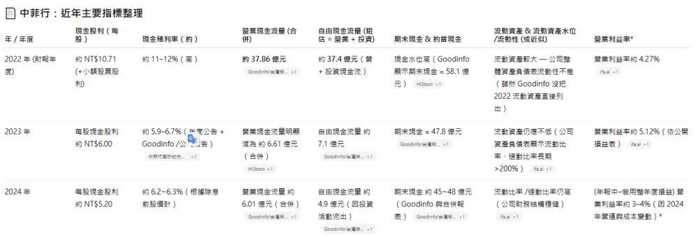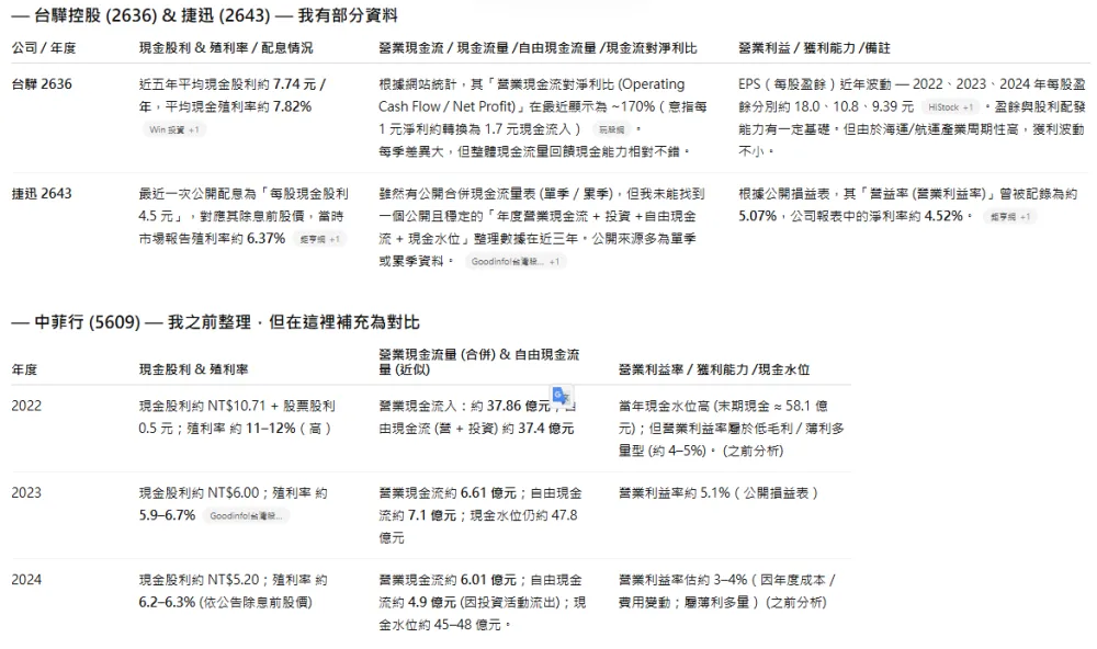 因此我們追問:『承上題,幫我將近三年殖利率、近三年(現金流量/流動資產)百分比、近三年營業利益率做成表格,並提供中菲行前兩大競爭對手的同樣數據。』