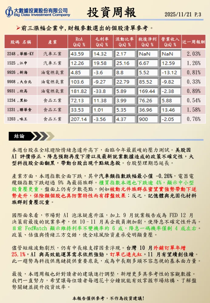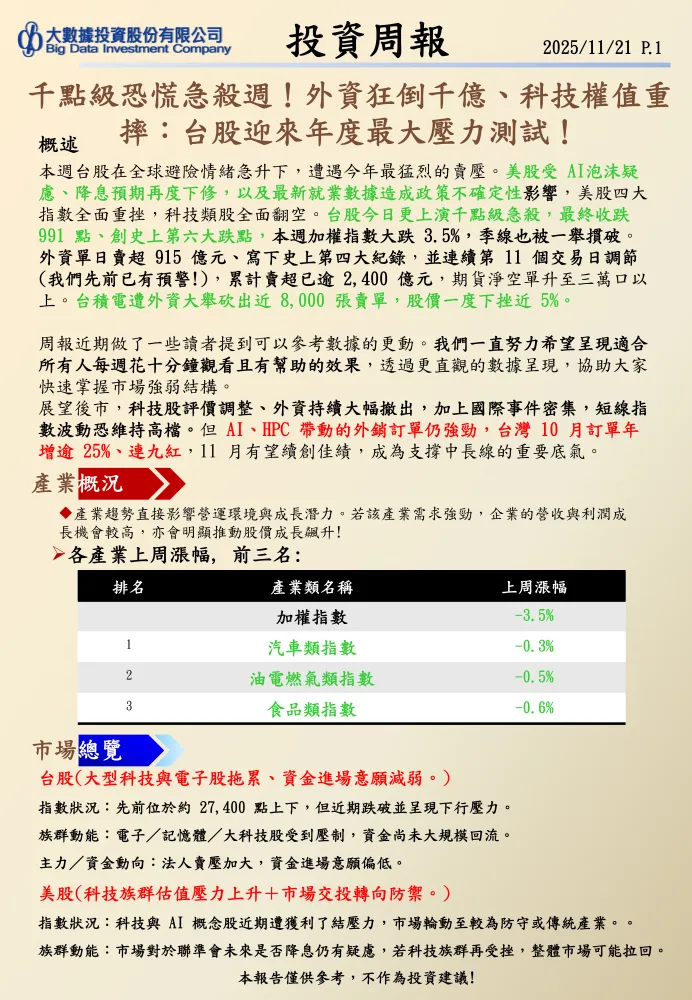 上週台股加權指數下跌2.99%,拖累多數產業走低。漲跌幅前三的產業中,僅生技醫療類微幅上漲0.12%,而橡膠類和貿易百貨類則分別下跌0.29%和0.57%。特別值得注意的是,油電燃氣類股已連續四周居跌幅前三,表現持續低迷。
