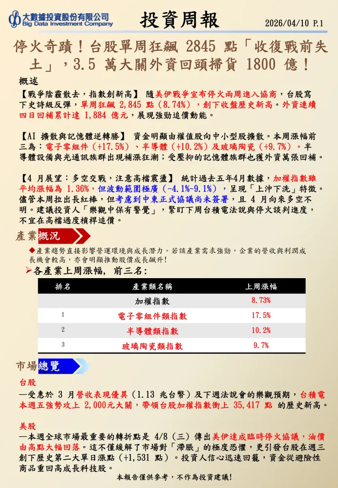 上週台股市場受到AI技術熱潮影響,半導體類指數以4.9%的漲幅領先大盤,電機機械類指數和光電類指數分別上漲4.5%與4.1%,顯示市場對AI轉機器人應用的高度期待。加權指數同步上漲3.4%,展現整體市場的強勢表現。