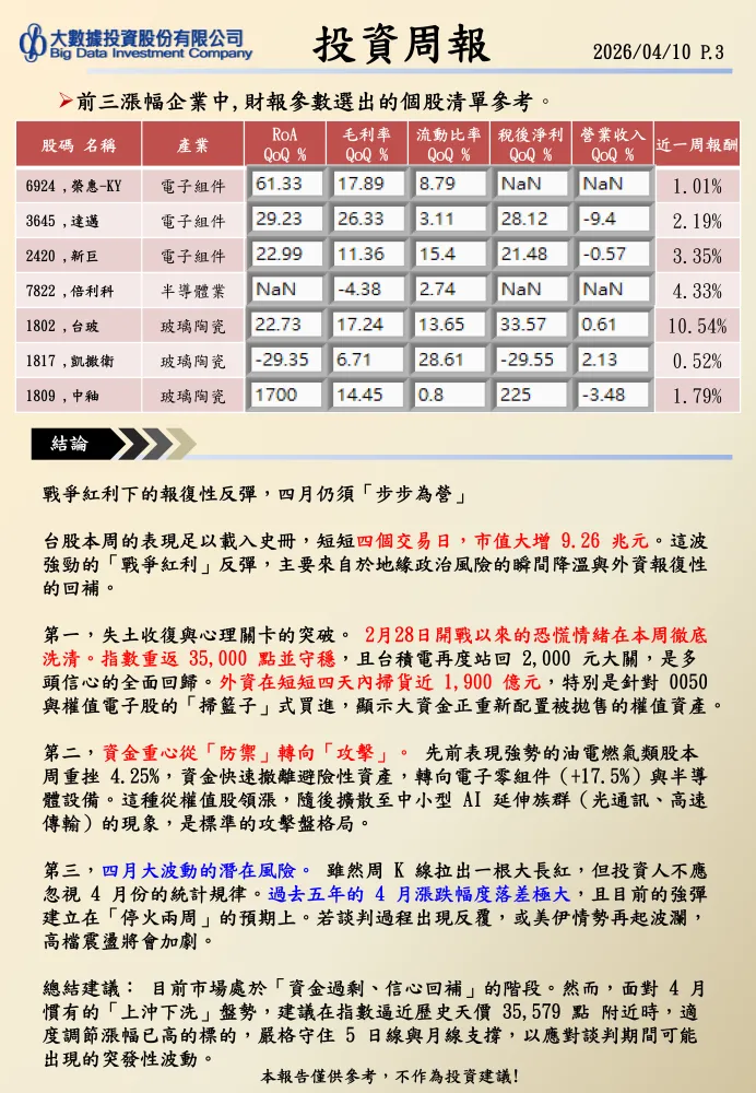 上週市場遭遇重挫,加權指數下跌2.7%,類股輪動劇烈,熱錢撤出前期飆漲的科技股,導致 「其他電子」、「電子零組件」、「電腦及周邊設備」 成為本週跌幅前三的產業。漲多回跌的情況顯示市場趨於保守,投資人需審慎應對。 本週表現相對穩健的三大產業為 水泥(+0.1%)、食品(-0.3%)、金融保險(-0.4%),顯示防禦型資產仍受到資金青睞。然而,整體市場受美股波動與關稅戰影響,投機風氣剛起即被抑制,短線操作難度提升。 展望4月,根據過去五年統計,市場波動加劇,指數呈現暴漲暴跌,加權指數平均月漲幅為 0.54%,櫃買指數則為 -0.28%,顯示市場存在高度不確定性。因此,建議投資人降低槓桿、控制風險,密切關注國際市場變化,穩健布局!