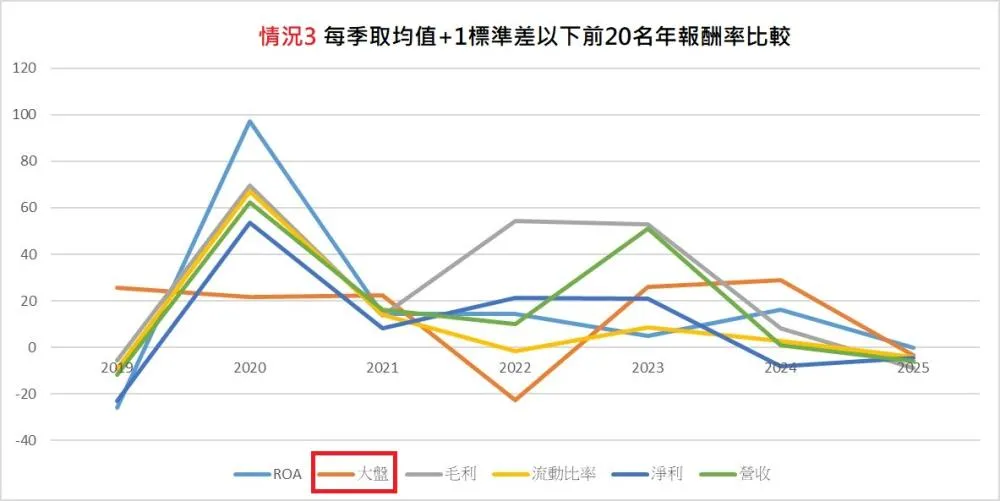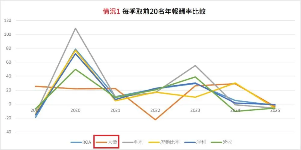分析結果顯示,在三種篩選條件下,單一財報參數選股的平均報酬率普遍優於大盤。其中,直接取「前20名」的方式表現最為穩定,波動度也相對較低。