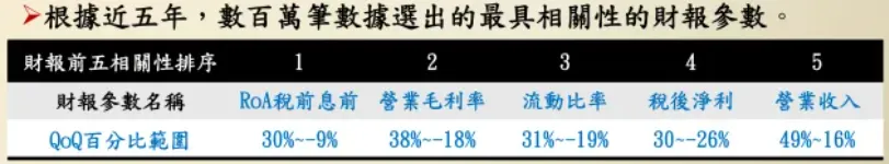 經統計,我們篩選出 前五大與股價報酬率最具相關的財報參數,並整理其合理範圍。這些參數在歷年檢驗中,展現出明顯的正向關聯,對於投資判斷具有高度參考價值。