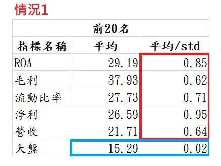 如同下列三圖表的結果,在此類統計中, 1情況中(直接取前20名),用單一財報參數選股的表現,近五年平均報酬率明顯比加權指數好;甚至比較跟2、3情況中的『平均報酬/分散度』,情況1沒有明顯的非線性表現,且整體穩定性相對較優,因此最後我們選擇了1條件!