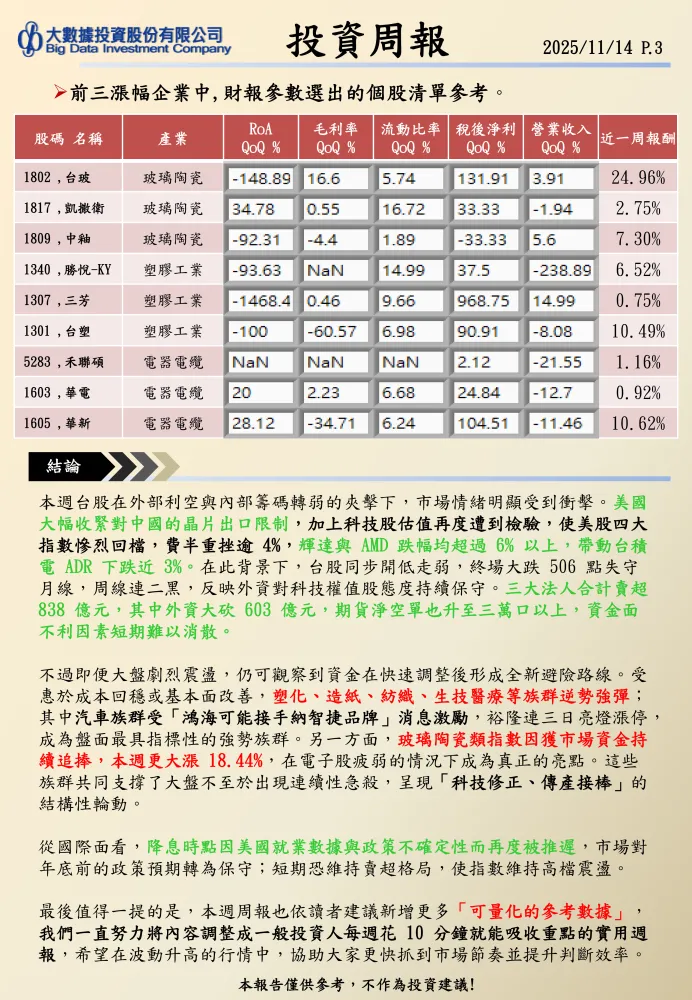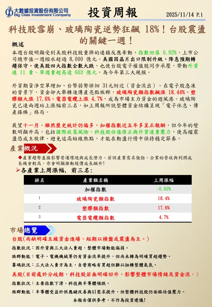 上週台股市場呈現分化局勢,通信網路指數與電子零組件類指數得0.5%與0.4%的小幅上漲,而半導體類指數則以0.3%漲幅位列第三。反觀油電燃氣類指數,跌幅連續六周排名前三,值得投資人密切關注。本周加權指數跌0.74%,顯示市場信心不足。